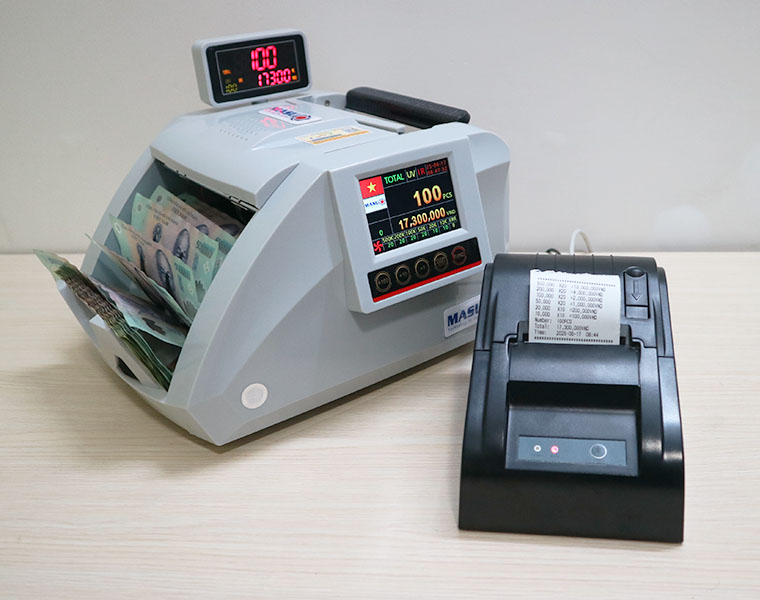 - Máy in hóa đơn chuyên dụng: In tổng số tiền, số lượng tờ, chi tiết số lượng & giá trị từng mệnh giá.