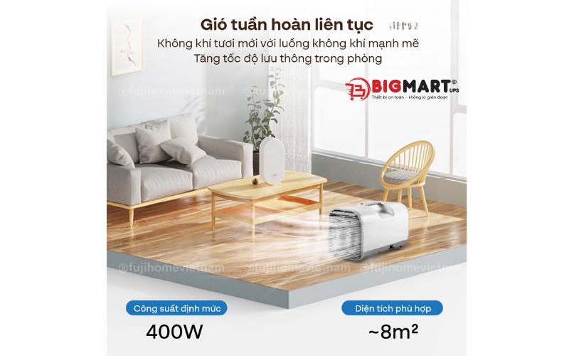 Máy sử dụng nguồn điện 220-240V/50-60Hz, công suất định mức 420W, có điều khiển bằng giọng nói,kết nối Blutoothe nghe nhạc qua điện thoại, thích hợp cho phòng ngủ nhỏ, cabin oto, mobihome, làm mát cho thú cưng, lều trại khi đi dã ngoại, các không gian <=8m².