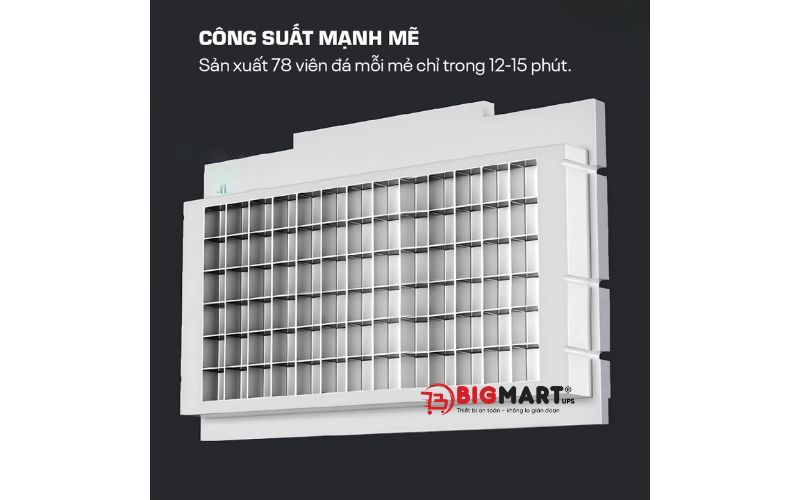 - Công suất mạnh mẽ: Sản xuất 78 viên đá mỗi mẻ chỉ trong 12–15 phút.