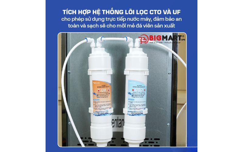 - Điểm khác biệt nổi bật của Fujihome IM70C chính là tích hợp hệ thống lọc nước kép CTO + UF, giúp loại bỏ tạp chất, cặn bẩn và kim loại nặng có trong nước. Nhờ đó, mỗi viên đá được tạo ra đều trong suốt, tinh khiết và an toàn cho sức khỏe – hoàn hảo cho các quán trà sữa, cà phê, bar hay nhà hàng cao cấp.