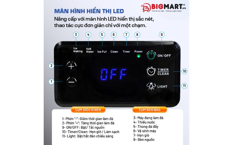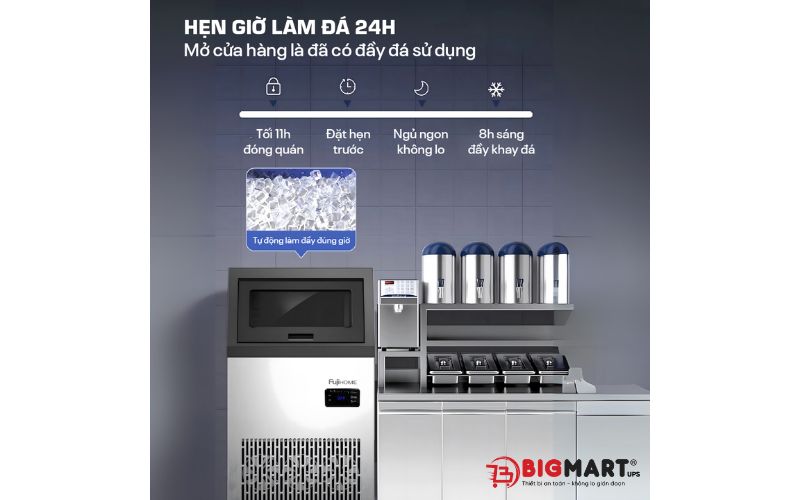 Với khả năng sản xuất đến 70kg đá mỗi ngày, sản phẩm giúp bạn luôn có nguồn đá tinh khiết, sẵn sàng phục vụ khách hàng mà không lo gián đoạn. Cùng Bigmart tìm hiểu thêm thông tin sản phẩm này nhé!