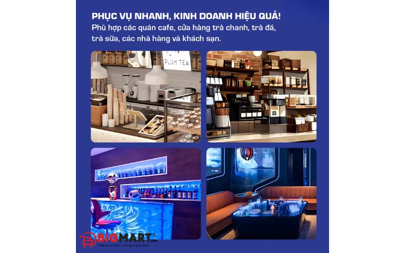- Kích thước nhỏ gọn, dễ bố trí trong quầy bar, khu bếp hoặc không gian phục vụ.