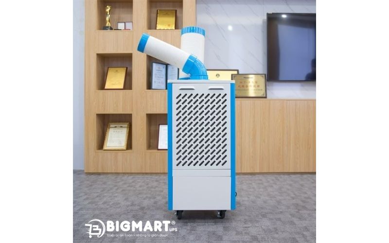 Máy trang bị bánh xe chịu lựcgiúp người dùng thuận tiện điều chỉnh vị trí theo nhu cầu sử dụng, từ khu vực máy móc tỏa nhiệt cao đến các không gian mở như nhà xưởng, kho vận hoặc sự kiện ngoài trời.
