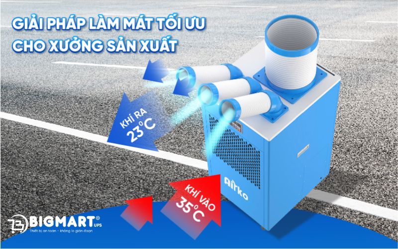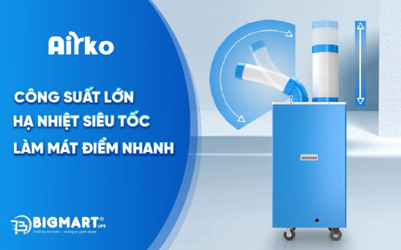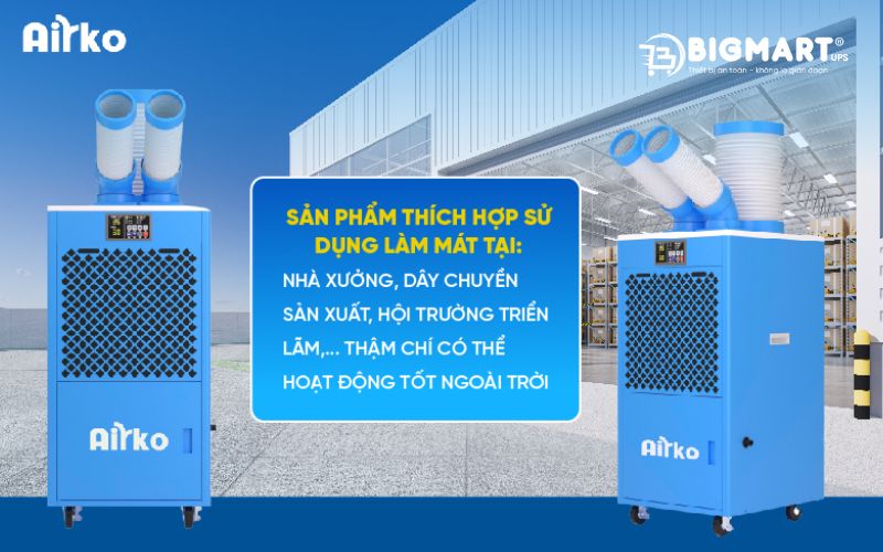 Với khả năng làm mát mạnh mẽ và phạm vi hoạt động rộng, Airko DAKC‑45 New 2025 đặc biệt hiệu quả trong các không gian lớn như nhà xưởng, kho hàng, trạm biến áp, nhà máy sản xuất hoặc khu vực tổ chức sự kiện ngoài trời.