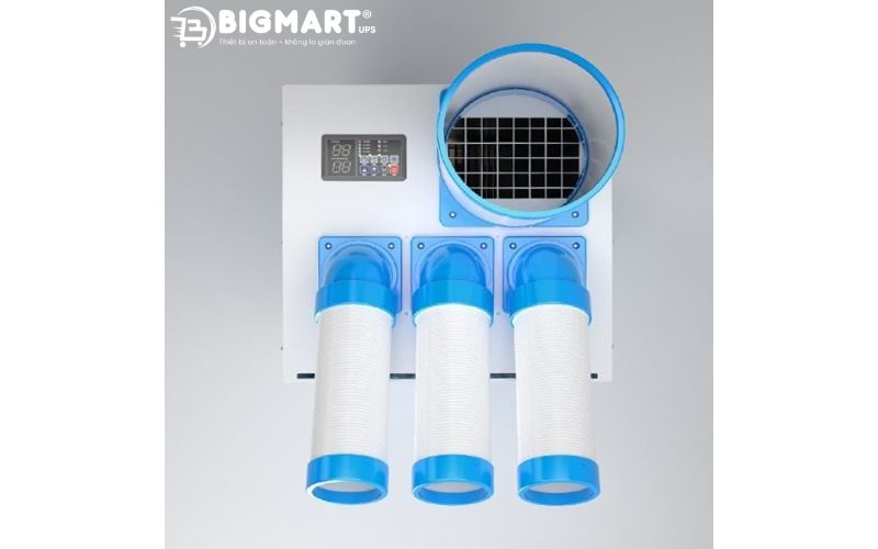 Thiết bị được trang bị quạt thổi lưu lượng cao lên tới 900 m³/h, kết hợp với 3 ống dẫn khí lạnh đường kính Ø150mm và 1 ống xả khí nóng Ø300mm, giúp phân phối không khí mát đều và đẩy khí nóng ra ngoài nhanh chóng, đảm bảo môi trường làm việc luôn thoáng mát, dễ chịu.
