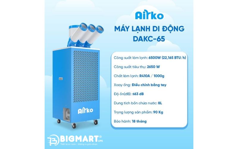 Điều hòa di động công nghiệp Airko DAKC-65New 2025 làsản phẩm của tập đoàn Dorosin Group, sản xuất tại Trung Quốc vàbảo hành chính hãng 18 tháng. Hiện sản phẩm đangđược phân phối tạiBIGMART với giá bán vô cùng ưu đãi.