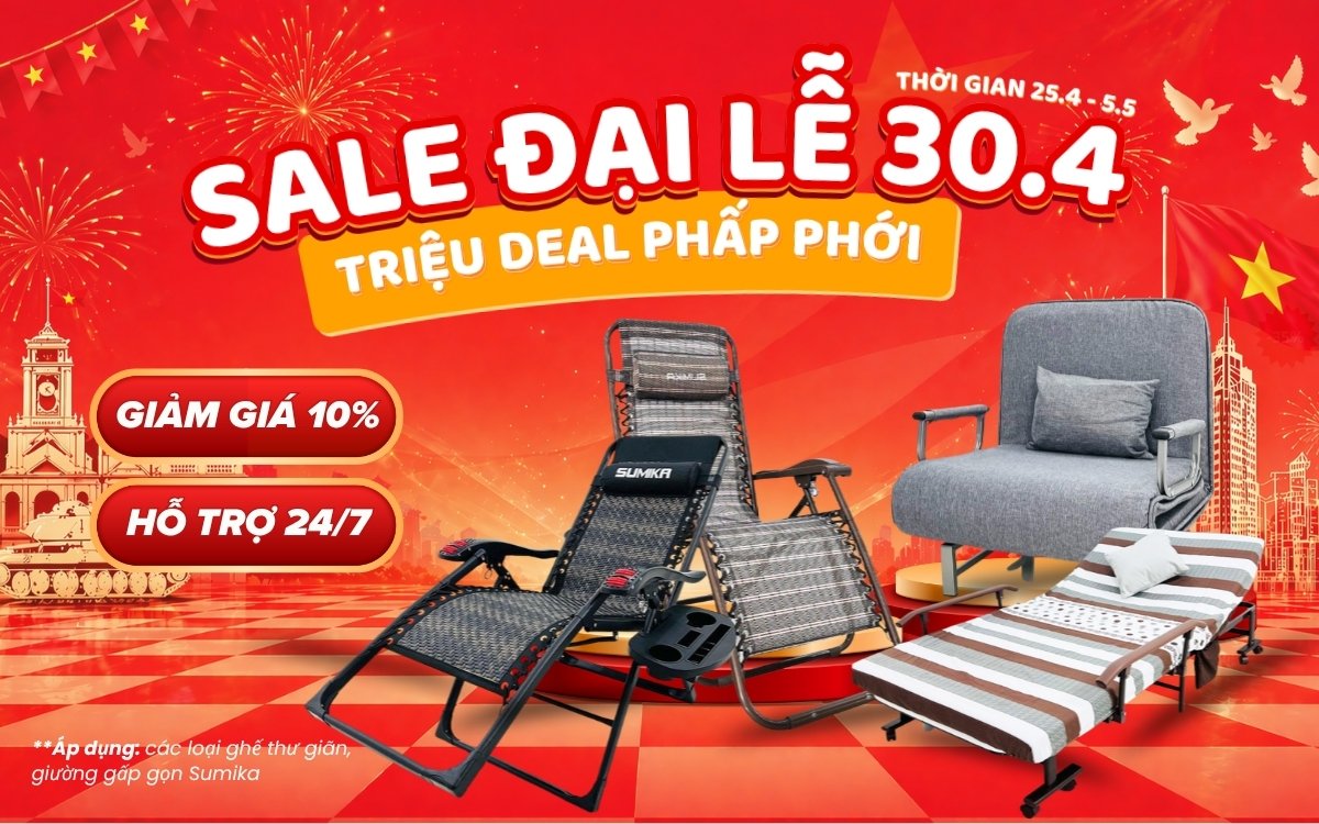 Hòa chung không khí tưng bừng của đại lễ 30/4 - 01/5, Bigmart triển khai chương trình khuyến mãi hấp dẫn dành cho các dòng ghế thư giãn, giường gấp gọn SUMIKA – giải pháp nghỉ ngơi tiện lợi, phù hợp cho mọi không gian sống!